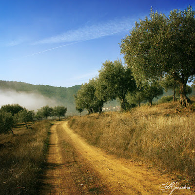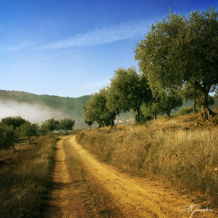 Do lado de lá do caminho, continuavam os tabuleiros de milho, alto em toda a parte, porque era regado, lá se vendo os regos condutores da água cortando as terras e até o caminho, em todas as direcções. E o cenário continuava em linhas quebradas até ao ribeiro, onde algumas lavadeiras ensaboavam peças de cor.