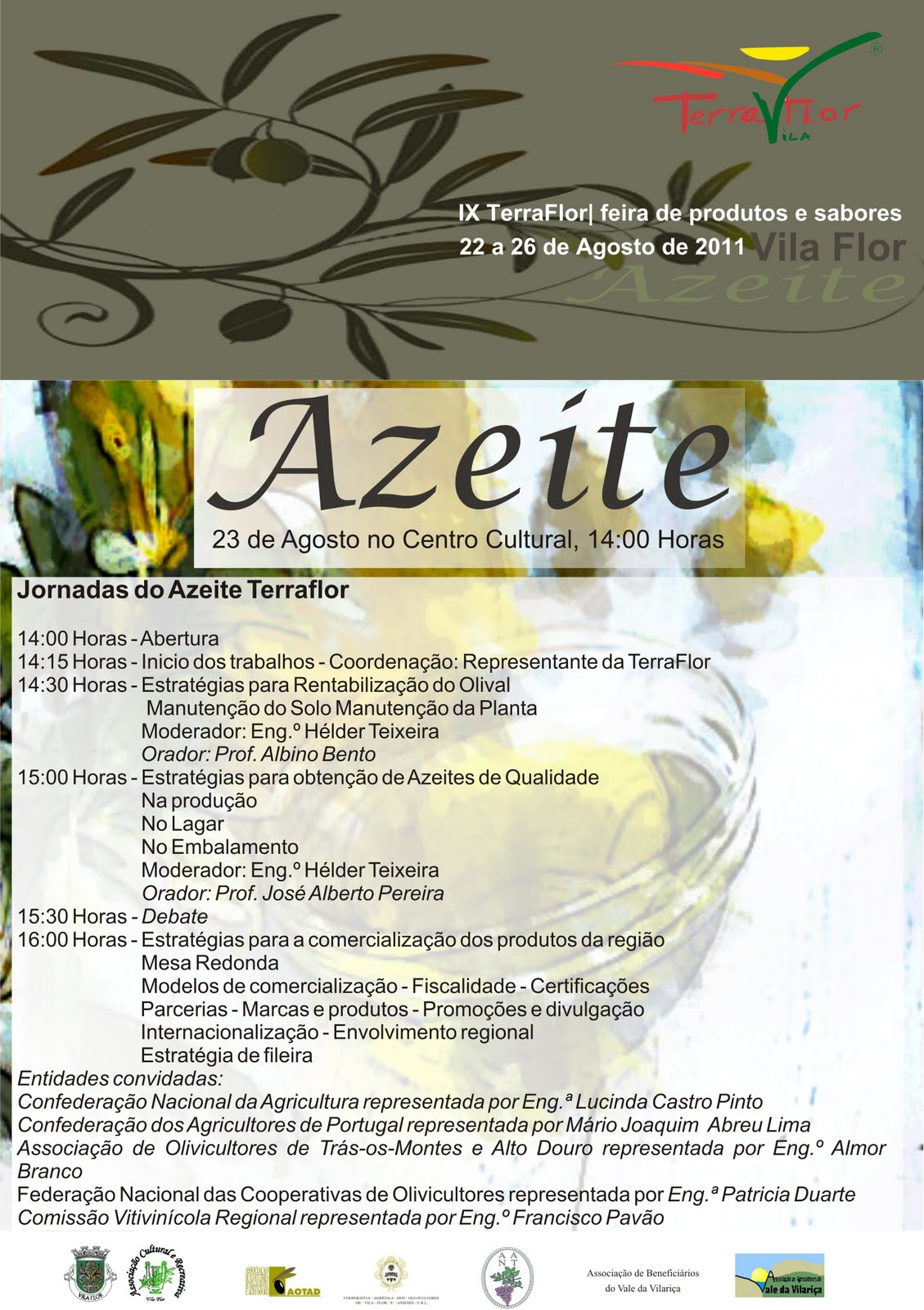 Não estive presente na abertura e primeiros dias da IX TerraFlor, mas fiz questão de participar no colóquio Agricultura – Comercialização e Estratégias de Mercado, que teve lugar no dia 25 de Agosto, com início pouco depois das 14 horas. Embora a agricultura não seja uma presença constante na minha vida, sou filho de agricultores, está presente na minha formação académica e bastava interessar-me pelo que se passa em Vila Flor, concelho marcadamente rural para me interessar pelo assunto. O Azeite é o produto referência do certame e já tinha tido um dia que lhe foi inteiramente dedicado (que perdi, com muita pena minha).